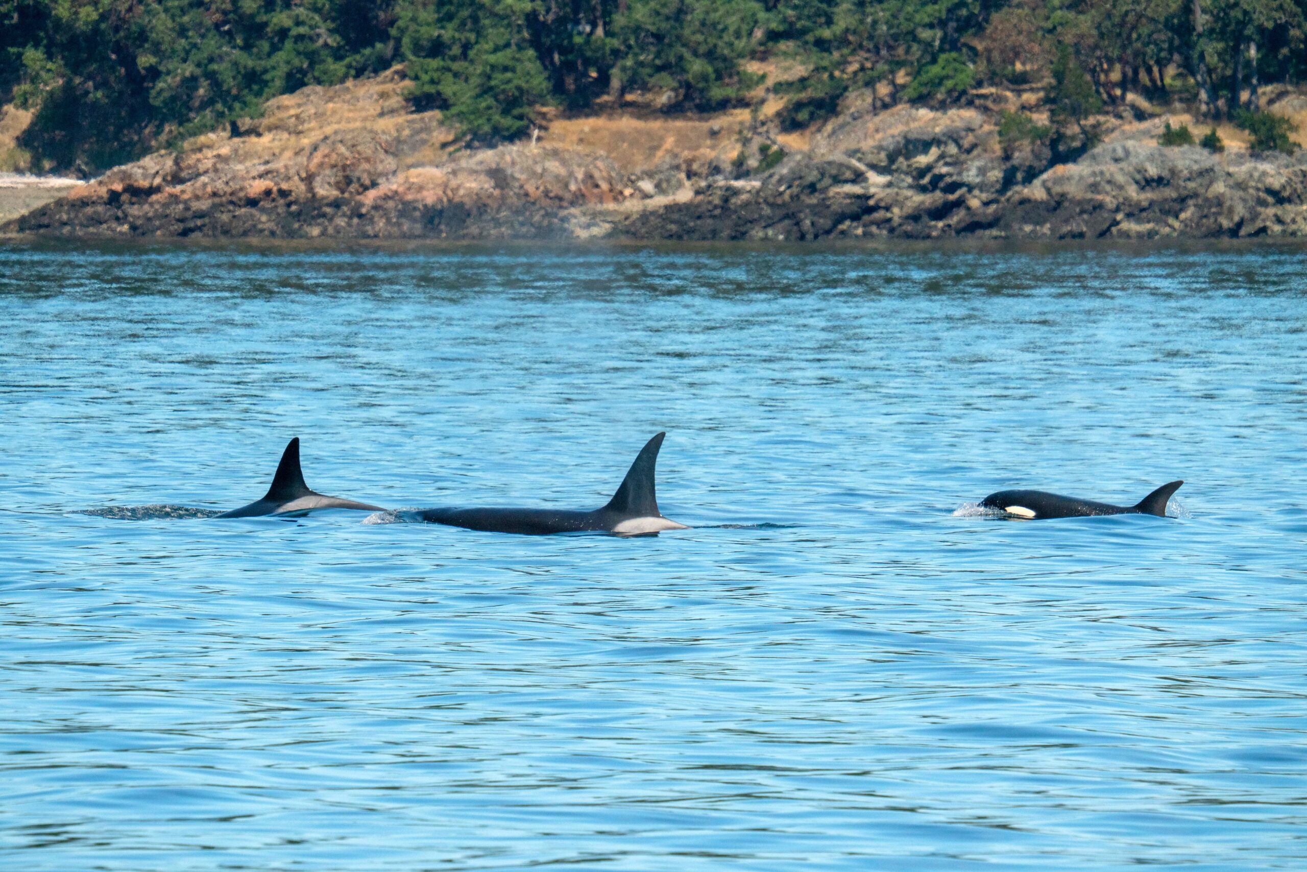 After a wide trip and barnes and clark islands to be able to look at the scenery and get everyone through the lunch line before whales, we circled back to Pt Lawrence and the Peapod Rocks off the south side of Orcas Island. We met up with the T46Bs cruising through the massive amount of current at the Peapod Rocks. With slow speeds, they turned north up to Clark and Barnes Islands where they had a change in behavior and started to hunt for their own lunch! We were able to watch them lunge and catch a harbor porpoise, coming up behind our boat with a chunk in one of their mouths. The pod was busy tail slapping to stun their prey, doing headstands and spy hops for looking around, as well as few full body barrel rolls at the surface. The whales stayed in the overall same location for quite a long time, having lunch and some fun!