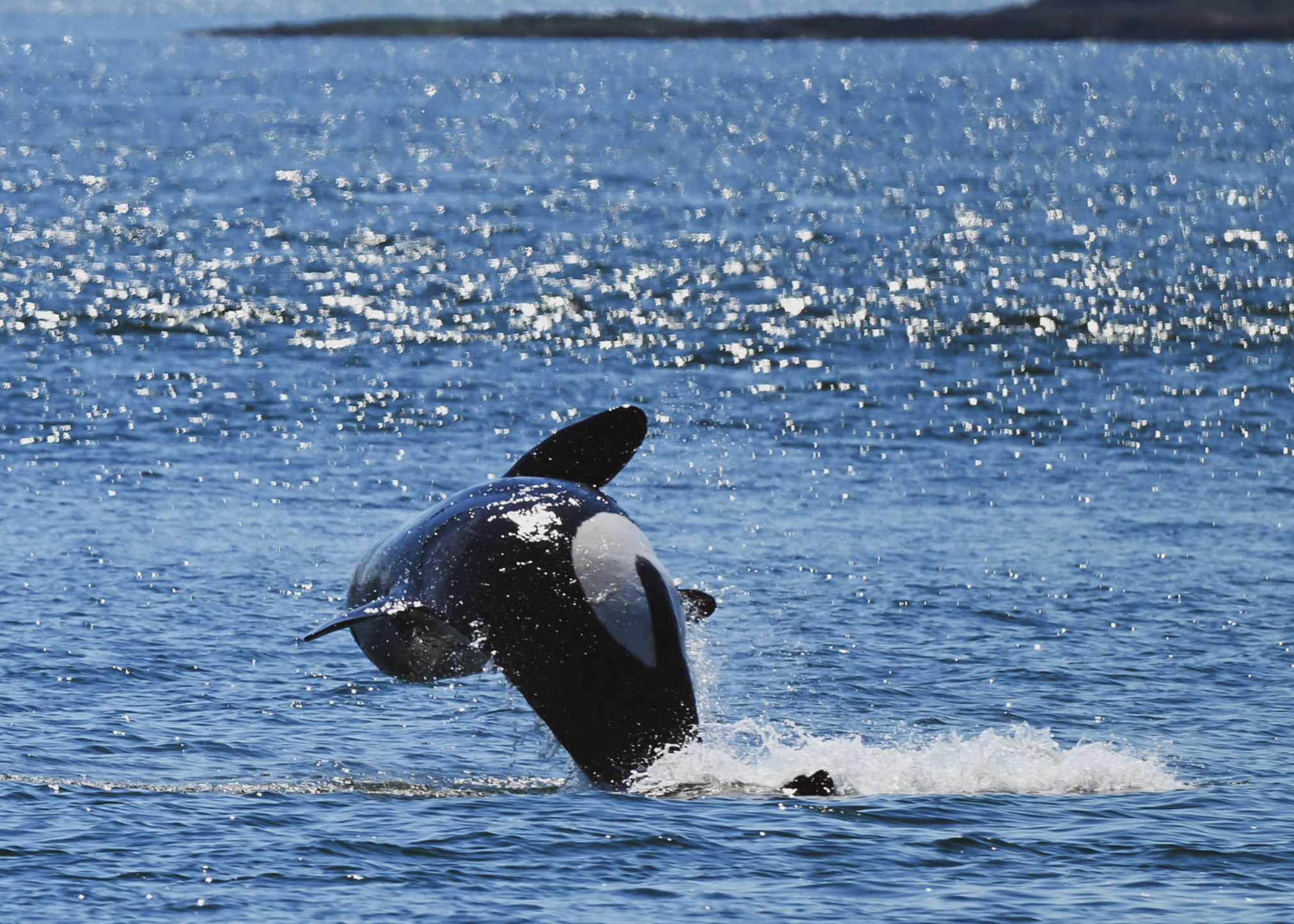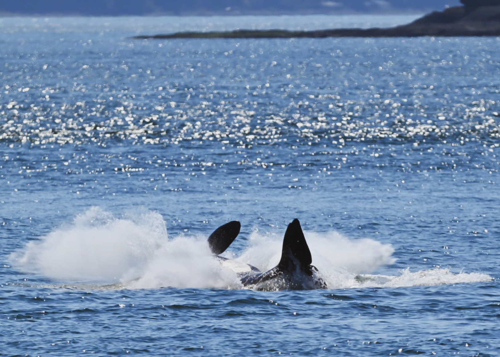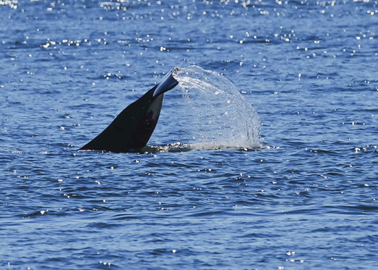 This was really exciting, because the pod seemed to be taking the day very easy, with slow travel and showing the baby some new tricks. We saw mom and older sister tail lob in sync, and then the little baby copied them! It was adorable behaviour, as the calf was zipping around all of the adults. We even saw one of the older whales breach! It was a full twist out of the water, with a huge splash landing. It was quite the joyful group of orcas today.