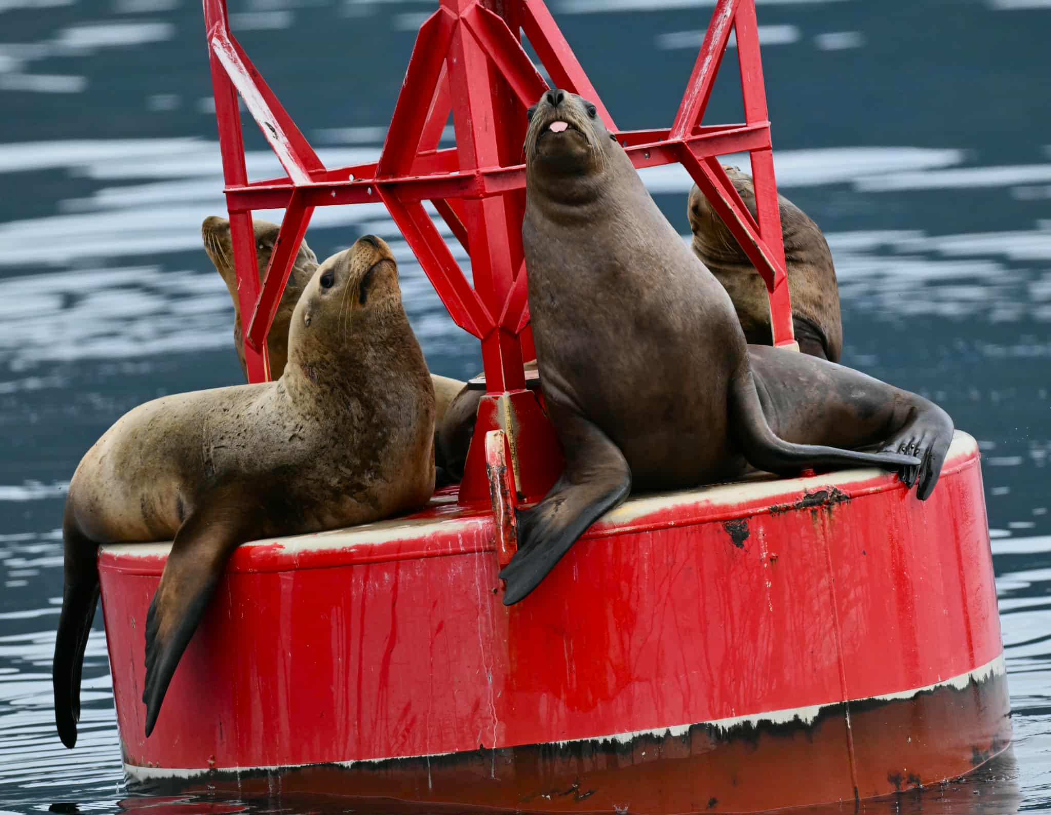 When we departed scene, we quickly came across a minke whale, turning our Monday adventure into a double species day! This minke was quite surface active and consistent, which is rare for the notoriously “slinky minke”. It seemed like it was lunge feeding, as we got to see the rostrum. Minke whales are the smallest of the rorqual whales, as they all have expanding throat pleats. On the way back we went up Rosario to the Sinclair markers where sea lions were hauled out taking a nap and cuddling. Multiple whale species days are always welcome.
