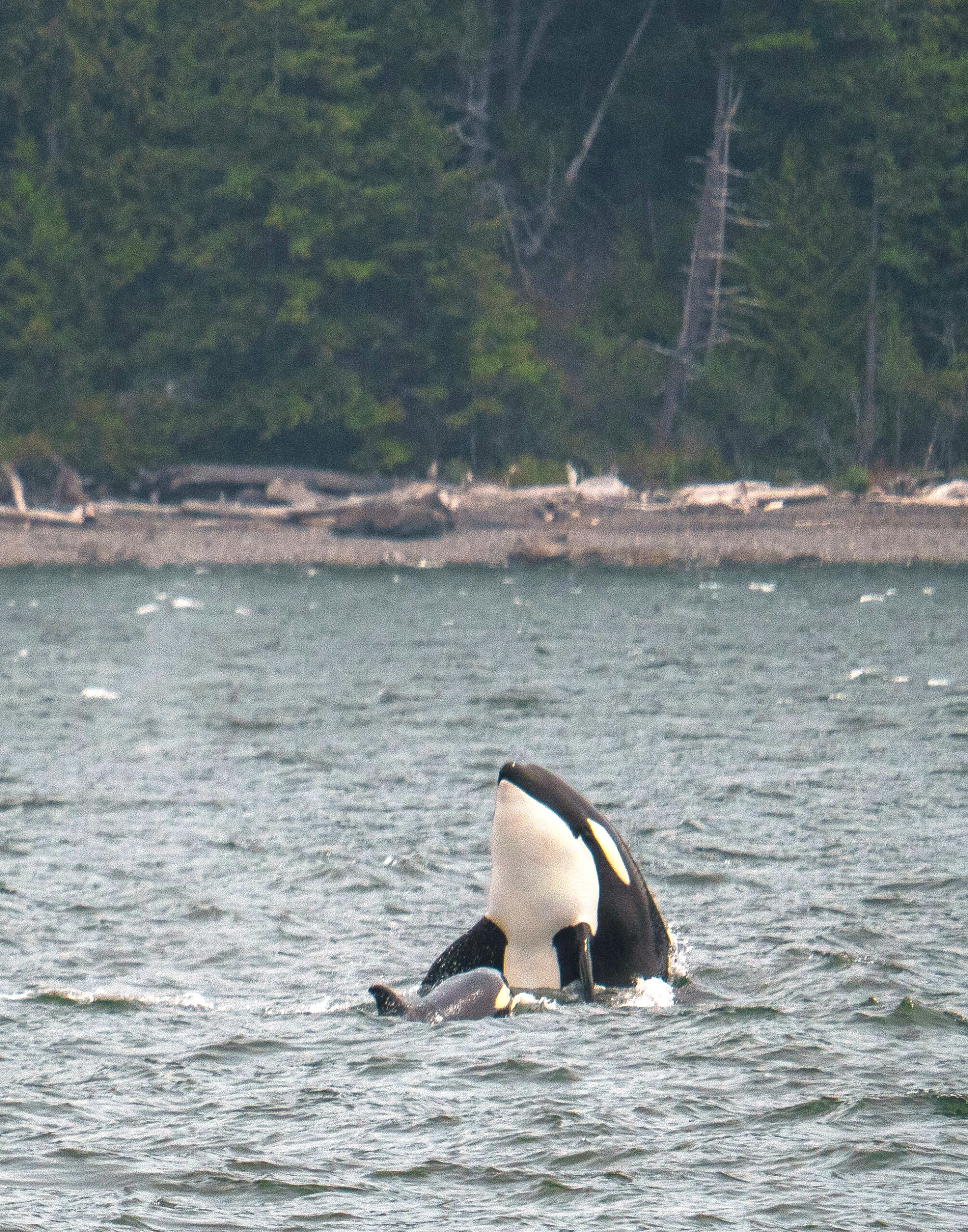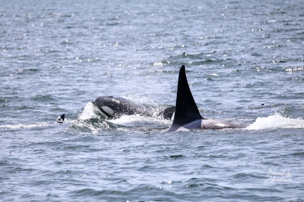 We caught up with T63-Whidbey, and T65-Chainsaw (a legendary 47 year old male with a serrated dorsal) along with T36-Flapjack, and the T36B’s lead by Tatertip. Tatertips 3 kids and newest grandkid were also present; the youngest whale, T36B1A, Maple, born this year!