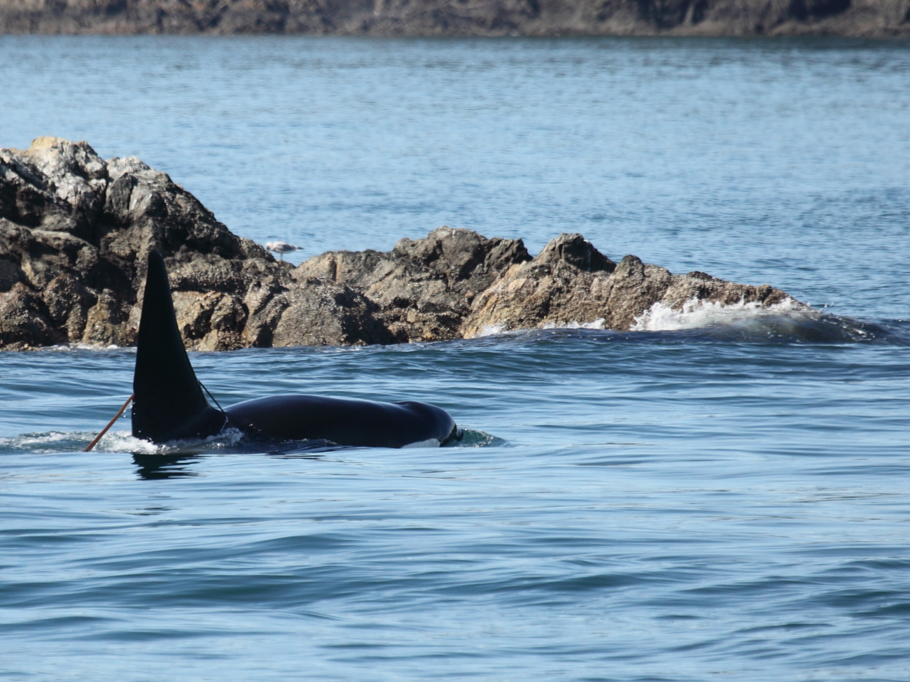 We spent a lot of time with the T49As today. One of the males, T49A1 or Noah, was hanging around a rock pile with some harbor seals around it. He was engaging in hunting behavior, and gave us one really neat spy hop.