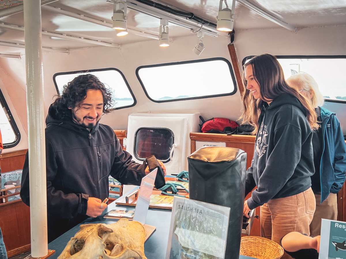 Orcas have a special place in the heart of our long-time naturalist Kara Drovdahl. She first saw them at age 4 on a whale watch, and loved drawing them in school notebooks. Kara took a summer course at Oregon Coast Aquarium where she was able to witness preparation of “Keiko”, the star of Free Willy, for an unprecedented attempt at release back into the wild via a flight back to Iceland. After moving to Bellingham and joining San Juan Cruises, Kara has enjoyed many interesting encounters with resident and Biggs orcas. Kara said, “People give them nicknames and can tell stories of the orcas’ families and life, and I just think that gives them such a connection to us as people, out on the water.”